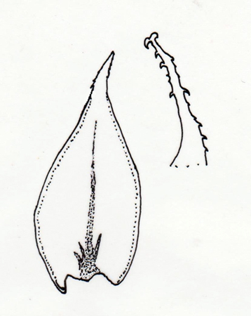 Blöðin eru oft einhliðasveigð á stönglum og greinum og eru um 3 mm á lengd, egglaga eða egglensulaga og mjókka smám saman eða snöggt í odd og eru með langfellingum. Þurr blöð eru aðlæg en rök lítið eitt útstæð. Blaðrönd er útundin beggja megin nærri fram í odd. Við blaðodd eru smáar tennur, sem vísa aftur, og er þetta mjög glöggt einkenni, sem sést við litla stækkun (20x), ef blaði er haldið upp á móti ljósi. Rif nær langleiðina fram í odd, er breitt og með eina eða tvær hliðargreinar neðst við grunn.