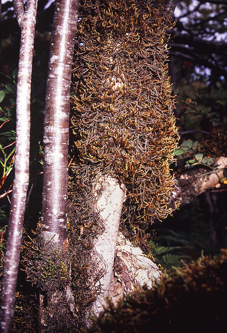 Þetta kynlega vaxtarform er aðeins þekkt hér á landi á einum stað, en það er í djúpri lægð í Eldborgarhrauni í Mýrasýslu, þar sem ríkja stillur og loftraki er mikill. Mosi vex þar á stofni á tveggja metra háum reyniviði (Sorbus aucuparia) og myndar þar langt skegg. Það þarf ekki að koma á óvart, að um sömu mosategund er að ræða og myndar slíkt vaxtarlag í Svíþjóð. Mosi þessi, sem er frekar stórgerður, er nefndur hraukmosi (Antitrichia curtipendula) og vex víða um land, einkum í fremur rýrum jarðvegi en einnig á steinum, klöppum og trjám.