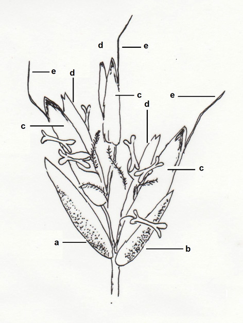 Blómagnirnar, neðri og efri, lykja hins vegar um sjálft blómið. Hin neðri er stoðblað blómsins en hin efri er forblað eða háblað öðru nafni. (Á öllum skýringar-teikningum eru agnirnar sýndar á stilk, en slík er ekki raunin. Agnirnar sitja hvor ofan í annarri og enginn stilkur sjáanlegur.)