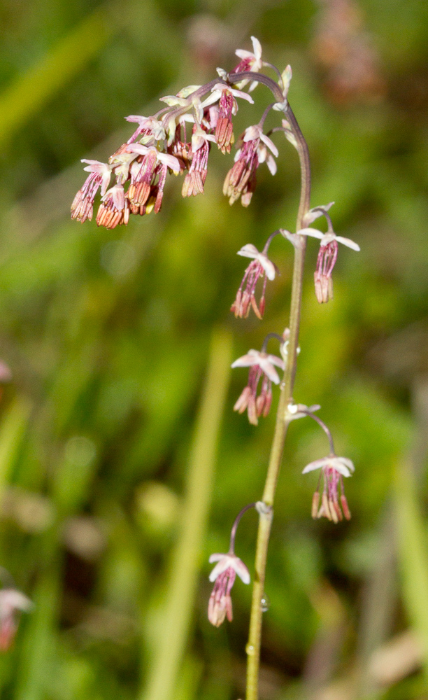 2 Frjóþræðir gildvaxnir og sverari en frjóknappar efst, hvítir eða fjólubláir. Hneta á stilk .. T. aquilegifolium (freyjugras)