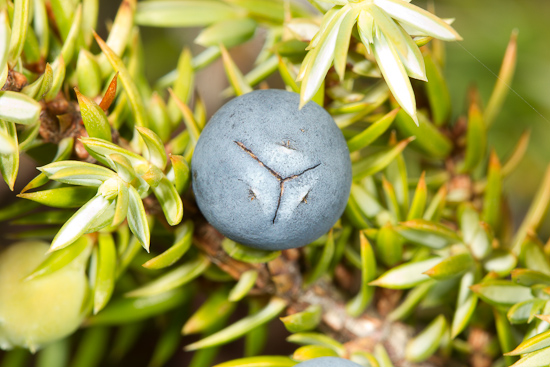 Fremst á þroskuðum einiberjum koma fræblöðin saman og má þar sjá þrjár skorur (sjá síðar).
