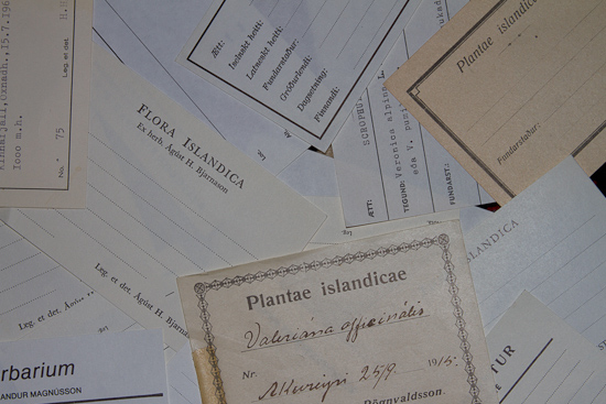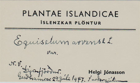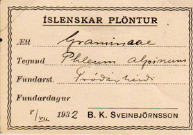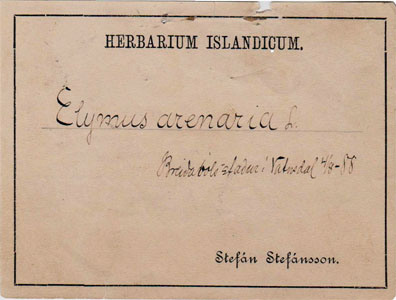 ÞAÐ ER GÖMUL venja að líma merkimiða neðst í hornið hægra megin á örk, sem þurrkuð planta hefur verið fest á, hvort sem hún hefur verið ákvörðuð til tegundar eða ekki.