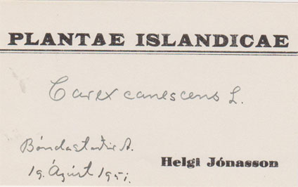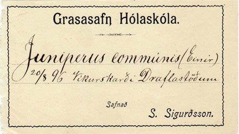 Þá er flórumiði frá 1896 úr Grasasafni Hólaskóla. S. Sigurðsson er Sigurður Sigurðsson (1871-1940), skólastjóri og búnaðarmálastjóri, en hann var alinn upp á Draflastöðum en fæddist á Þúfu í Fnjóskadal. Stærð miða: 12,5 x 7 cm.