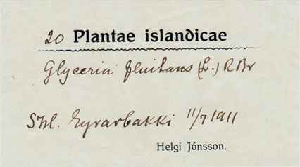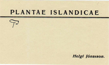 Flórumiði Helga Jónssonar grasafræðings frá 1911. Ekki er vitað, hvað tölustafur fyrir framan Plantae merkir. Stærð miða: 10,8 x 6 cm