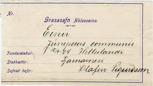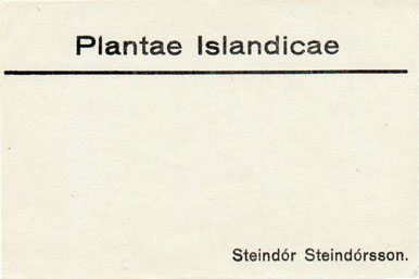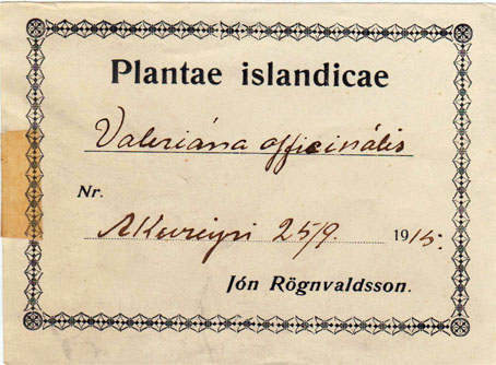 Flórumiði frá Jóni Rögnvaldssyni (1895 — 1972). Miðinn er frá 1915 eða fjórum árum áður en Jón hélt til Kanada til að nema garðyrkjufræði. Þar stendur Plantae islandicae og gert ráð fyrir hlaupandi númerum. Stærð miða: 11,5 x 8,5 cm