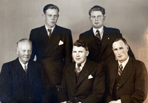 Á myndinni eru, talið frá vinstri: Fremri röð: Guttormur Pálsson (1884-1964), Hallormsstað, Hákon Bjarnason (1907-1989), Daniel Kristjánsson (1908-1982), Hreðavatni; aftari röð: Garðar Jónsson (1919-2003), Tumastöðum og Einar G. E. Sæmundsen (1917-1969), Vöglum. – Mikið vatn hefur runnið til sjávar frá þessum tíma og talsverðar breytingar orðið.