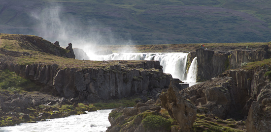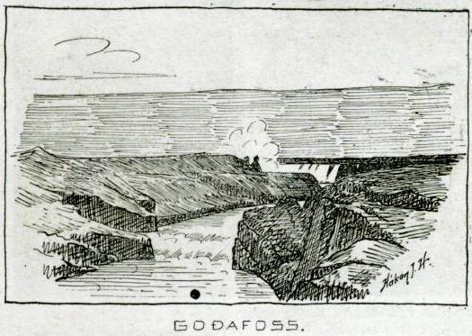 »Tveir einkennilegir klettar eru á bergbrúninni, austan megin árinnar, andspænis fossinum, og ber þá í úðann. Líta þeir út eins og að sjá þar ofan á tvo tígulega menn, sem horfa upp í fossinn. Það er þó aðeins annar kletturinn, sem heldur þessari líkingu af manni, þegar komið er mjög nærri klettunum, og sýnir síðari myndin það. Jeg hygg, að ásatrúarmönnum hafi komið hof í hug, er þeir litu þessa furðulegu sýn; svo mjög býst jeg við því, að klettarnir hafi mint á goð á stalli, og fyrir framan þessi goð var iðandi fossinn eins og hinn vígði eldur, er aldrei slokknaði. En þá má líka segja, að nafnið hafi verið komið. Þeir næstum hlutu að nefna hann Goðafoss.«