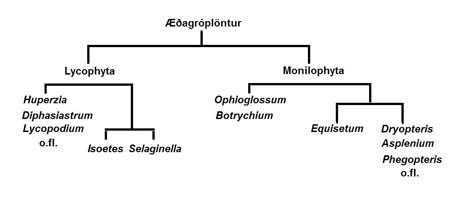 4. Blöð þorntennt; stönglar linir og fíngerðir (minnir á mosa) ……….. mosajafnaætt (Selaginellaceae) – 1 ættkvísl: mosajafnar(Selaginella), 1 tegund: mosajafni(S. selaginoides)