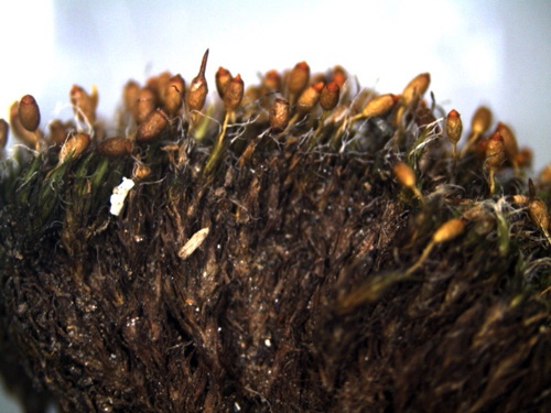 Stilkur mjög stuttur (0,4 mm) og hirzla því hulin af kvenhlífarblöðum. Hetta topplaga, kögruð neðst. Lok lágt og breitt. Tennur rauðgular, mjög götóttar. Gró um 11 µm að þvermáli, fínvörtótt eða slétt.