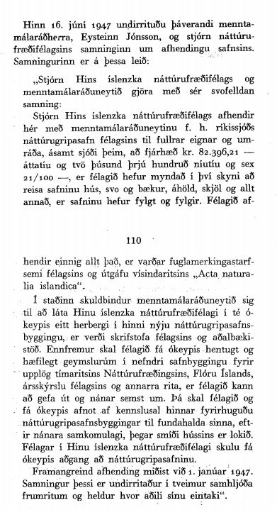 Stjórn Hins íslenzka náttúrufræðifélags getur ekki lengur skellt skolleyrum við ófremdarástandi í málum Náttúruminjasafns. Henni ber að fá samninginn frá 1947 dæmdan ógildan vegna vanefnda og endurheimta allar eigur sínar að nýju. Það verður að leita nýrra leiða. Grasasafn Stefáns Stefánssonar, Helga Jónssonar og fleiri, dýrasafn frá Bjarna Sæmundssyni og fjöldi annarra sýna hafa legið vanrækt í fjölda ára og hætt við að þessi söfn liggi undir skemmdum, ef sumt er ekki þegar ónýtt. Í raun eru þetta þjóðargersemar, ígildi mikilla listaverka.