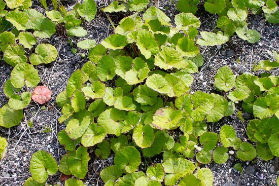 Fjölær jurt með skriðulan jarðstöngul. Blöð eru á löngum legg, stór og hóflaga, bugtennt eða grunnsepótt; ung blöð hvítlóhærð, en verða síðar hárlaus á efra borði. Blöð spretta ekki upp fyrr en að blómgun lokinni; í þeim myndast mikil næring, sem geymist vetrarlangt í jarðstöngli. Þetta gerir plöntunni kleift að þroska stöngul og blóm á undan flestum plöntum öðrum að vori. Blöð minna á lítil blöð á rababara. Blómknappar myndast reyndar að hausti og þurfa því ekki nema nokkra sólardaga og hlýju til þess að blómgast. Í raun má segja, að plantan nái ekki að ljúka vexti að hausti og verði því að bíða til vors.