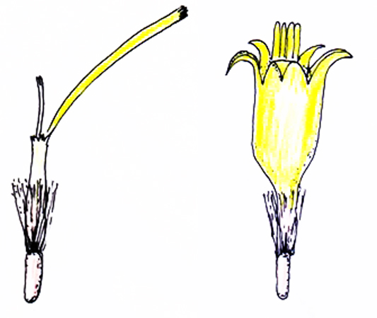 Blómstöngullinn vex upp snemma að vori og ber eina, endastæða, skærgula blómkörfu, 2 eða 3 cm að þvermáli. Á lóhærðum stöngli eru rauðleit hreisturblöð og framleiða þau nær enga næringu. Jaðarblómin eru tungukrýnd en hvirfilblómin, sem eru mun færri, pípukrýnd með fimm-tennta krónu. Það eru hvirfilblómin sem gefa frá sér blómasykur (nektar) og frjóduft en þau mynda sjaldnast fræ. Það er einkum í jaðarblómunum, sem eru eingöngu kvenblóm, sem fræ þroskast. Reifar eru í einföldum kransi, himnukenndar, grænar á röndum en annars fjólubláar.