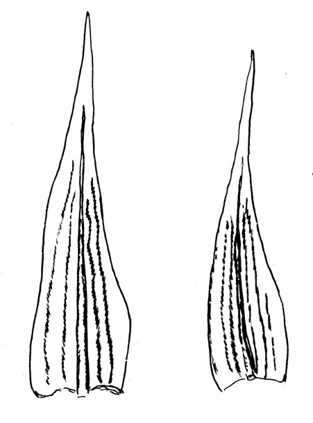 Blöð beggja tegunda; langfellingar eru áberandi; til vinstri er H. sericeum og til hægri H. lutescens. Teikn. ÁHB