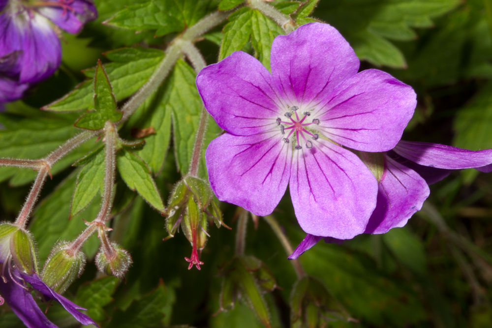 Blágresi (Geranium sylvaticum) verður stórvaxnast á friðuðu landi í kjarr- og blómlendi. Ljósm. ÁHB.