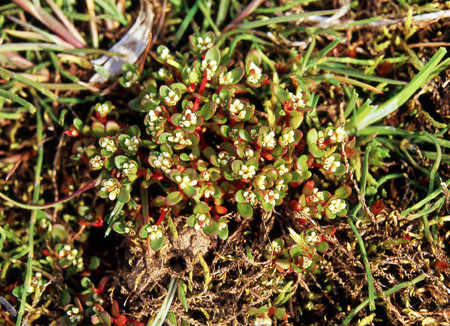 Einær, safamikil og hárlaus planta, sem oftast er aðeins nokkrir sentímetrar á hæð (1-7 cm). Stöngullinn er mjór, linur og nærri gagnsær, gulgrænn neðst en rauðfjólublár efst. Oft er hann óskiptur en á stundum kvíslaður. Greinar oft rótskeytar.