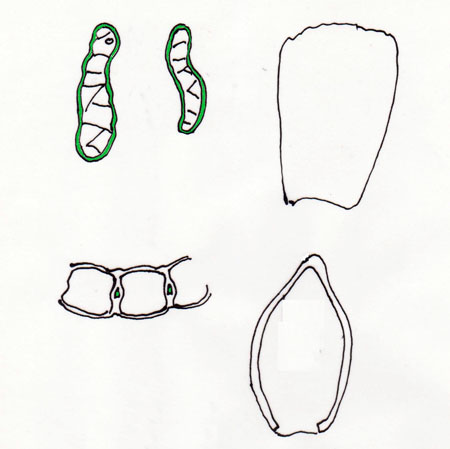 Greinablöð aldrei í röðum, þau eru breið, egglaga til breiðegglaga, mjög kúpt og með hettulaga enda. Grænfrumur í þverskurði egglaga eða þríhyrndar og veit breiðari hlið að innra borði.
