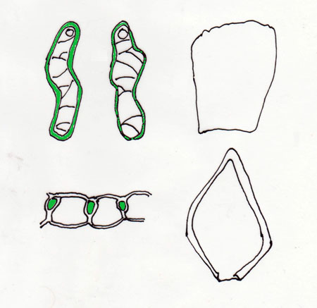 Glærfrumur með vörtótta veggi og 1-3 göt/frumu á neðra borði; engin göt á efra borði.