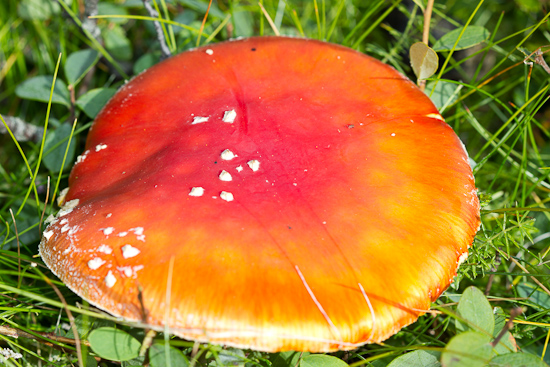 Berserkjasveppur (Amanita muscaria) er talinn eitraður. Hvítu hattflyksurnar eru leifar af heildarhulu. Hann vex í skógum, kjarri og hrísmóum. Hann vex víða um land en er algengastur á Norðausturlandi. Ljósm. ÁHB.