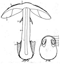 Langskurður af ungum og þroskuðum hattsveppi.. 1. heildarhula (myndar hattflyksur og skeið), 2. fanhula (myndar hengsli og kraga), 3. fanir, 4. stafur, 5. hattur