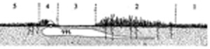 Þverskurður af hálfum nornabaug. 1. eðlilegur vöxtur inn við miðju, 2. grösugur innri hringur, 3. gróðurvana belti, 4. grösugur ytri hringur, 5. eðlilegur vöxtur utan hrings, m. sveppímur í jarðvegi.